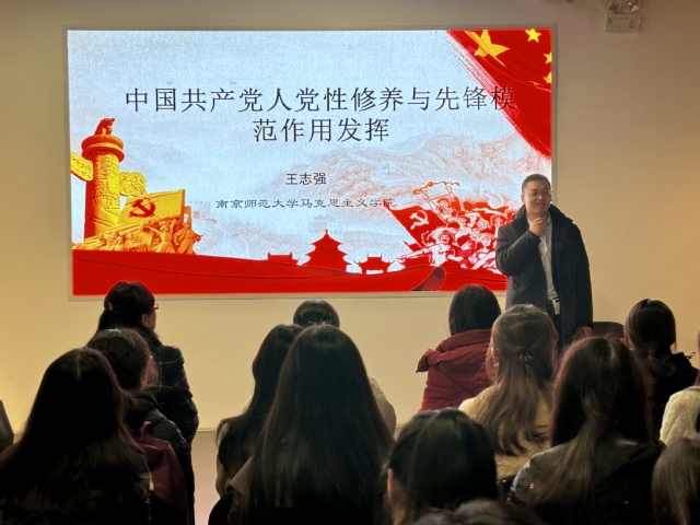 在博物馆工作人员的深情讲解下,党员师生参观了馆内珍藏的众多抗战文物与史料,重温抗战历史,感悟爱国的民间力量。随后,南京师范大学马克思主义学院党委委员、硕士生导师王志强副教授作《中国共产党人党性修养与先锋模范作用发挥》主题党课。王教授以习近平总书记对党员、干部的要求和贪腐干部的反面案例导入加强党性修养的意义,以毛泽东、邓中夏等革命先辈的事迹为例,深入阐释了中国共产党人“始终牢记初心使命、树立坚定理想信念”的精神内核,强调党性和人民性从来都是一致的、统一的,呼吁党员师生在新时代背景下,不断强化自我修炼、自我约束和自我改造。接着,“强国行”专项行动团队负责人、教师第一党支部书记姜凡以“缅怀烽火岁月,凝聚青春力量”为主题开展微党课,师生共同观看党史教育《胜利》第四集《血肉筑起的长城》,号召青年党员以革命精神为引领,将个人成长融入育人事业与国家发展。
