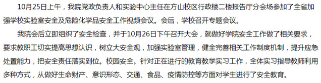 我院会后立即组织了安全检查,并于10月26日下午召开大会,就做好学院安全工作做了相关要求,要求教职工切实提高思想认识,树立大安全观,加强实验室管理,健全完善相关工作制度机制,提升应急处置能力,把安全责任落实到位。校园安全。针对正在进行的教育教学实习工作,全体实习指导教师利用多种方式,从做好生命财产、意识形态、交通、食品、疫情防控等方面对学生进行了安全教育。