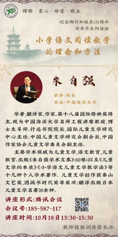 为纪念陶行知诞辰131周年,10月18日下午,教师教育学院邀请中国海洋大学朱自强教授开展“小学语文阅读教学的理念和方法”主题讲座,小学语文教育系冯军老师主持了本场讲座。我校和丽江师专的百余名师生相聚云端,共同聆听讲座。