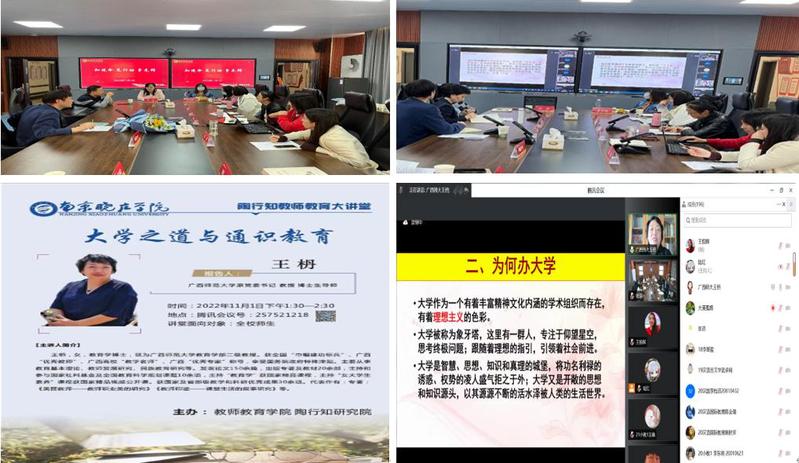 全体教职工首先在线聆听了特邀专家——广西师范大学教育学部王枬教授的讲座《大学之道与通识教育》。
